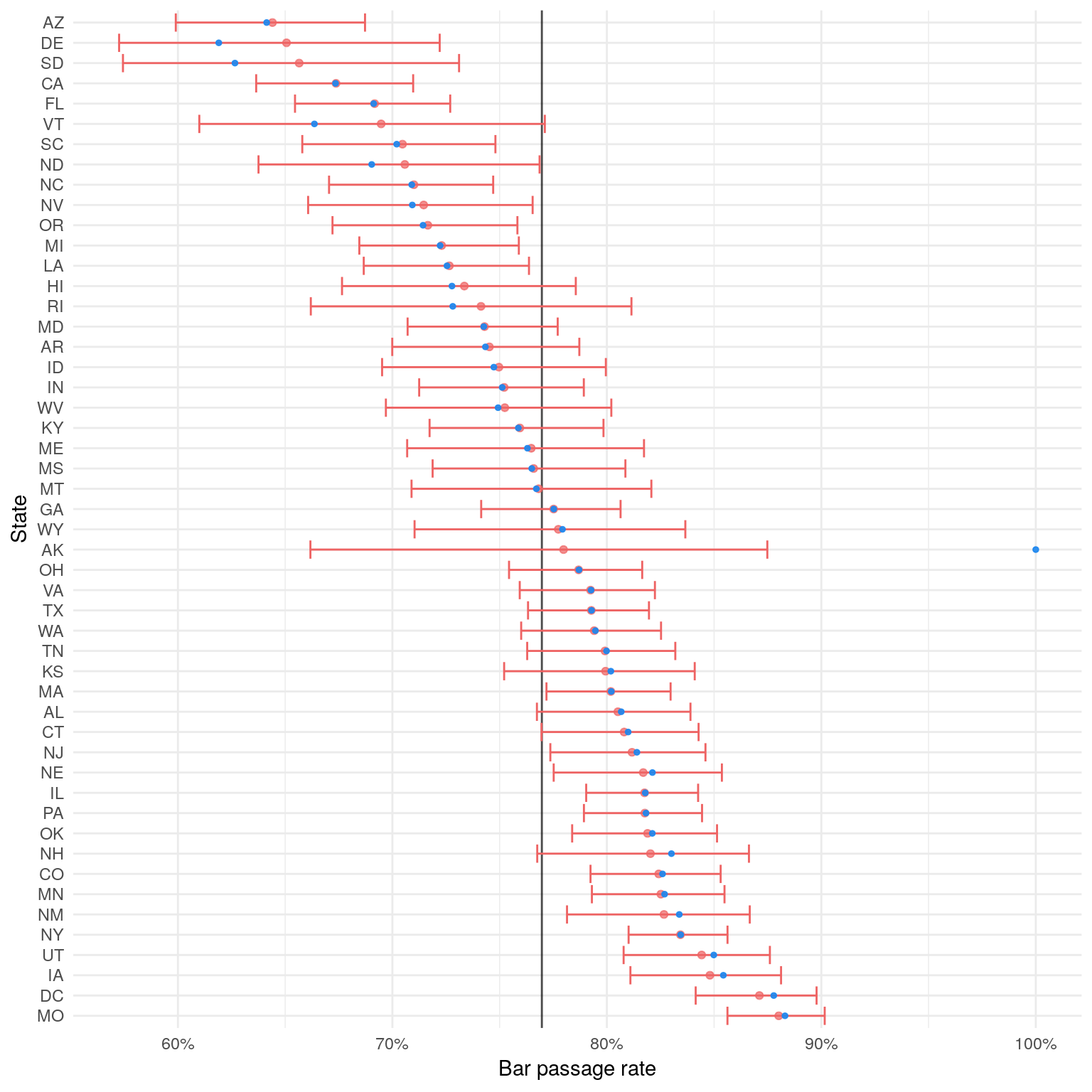 The plot below shows the results from a Bayesian hierarchical binomial model. The model is binomial because bar passage takes one of two values: pass or fail. The blue dots are the state’s actual pass rate, while red dots are the estimated pass rates. The red line represents the 90% highest posterior interval (HPI). The HPI is akin to the frequentist’s confidence interval. In fact, the HPI is what most people think a confidence interval means: there is a 90% chance that the true infinite takers pass rates falls within the 90% HPI.